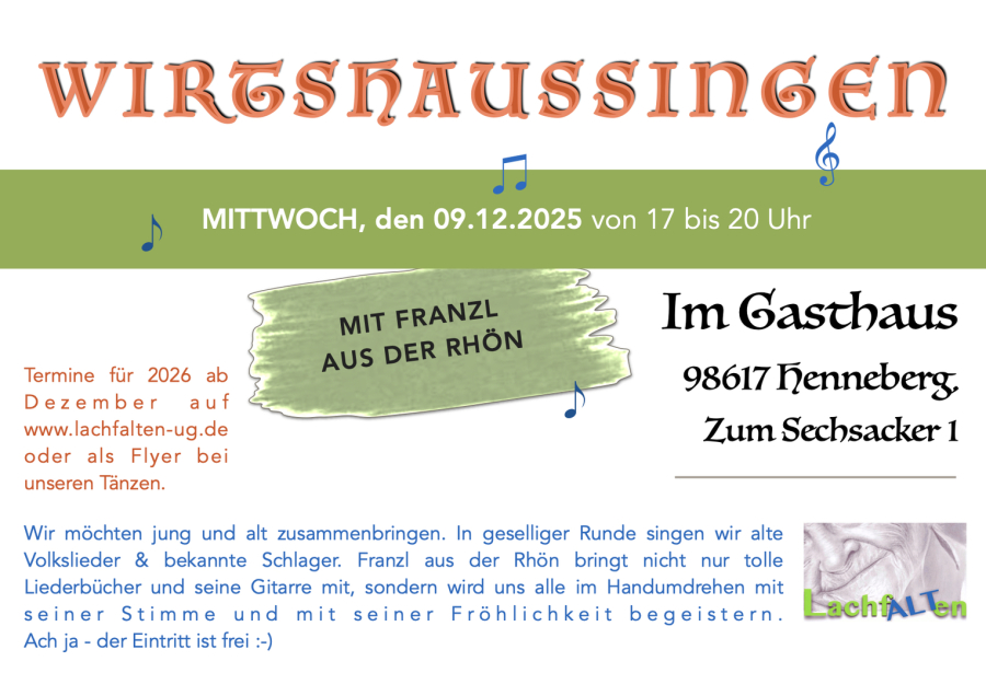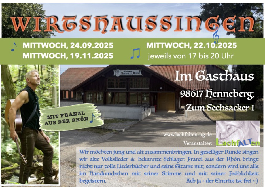 wird. Also: Stimme ölen, Kehle frei, und ab in die "Schwarze Henne" nach Henneberg! Das LachfALTen-Team freut sich, den Franzl aus der Rhön präsentieren zu können. Er bringt übrigens genügend